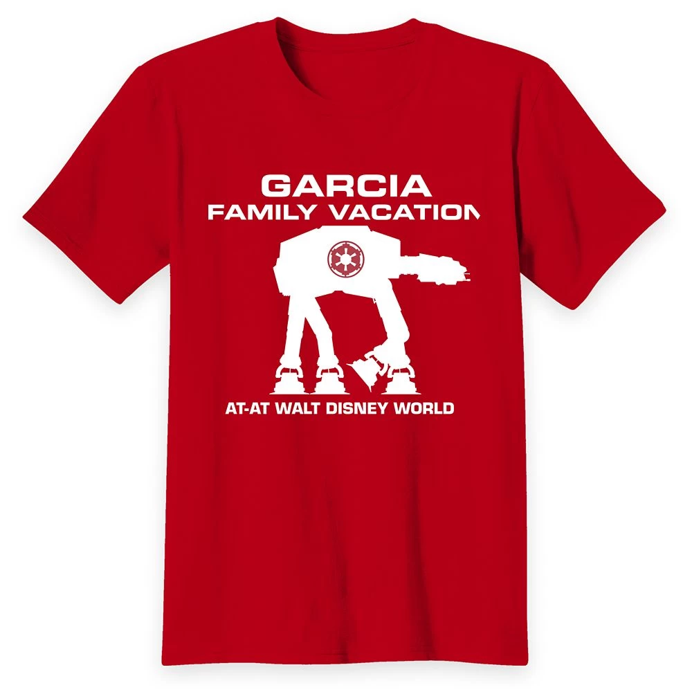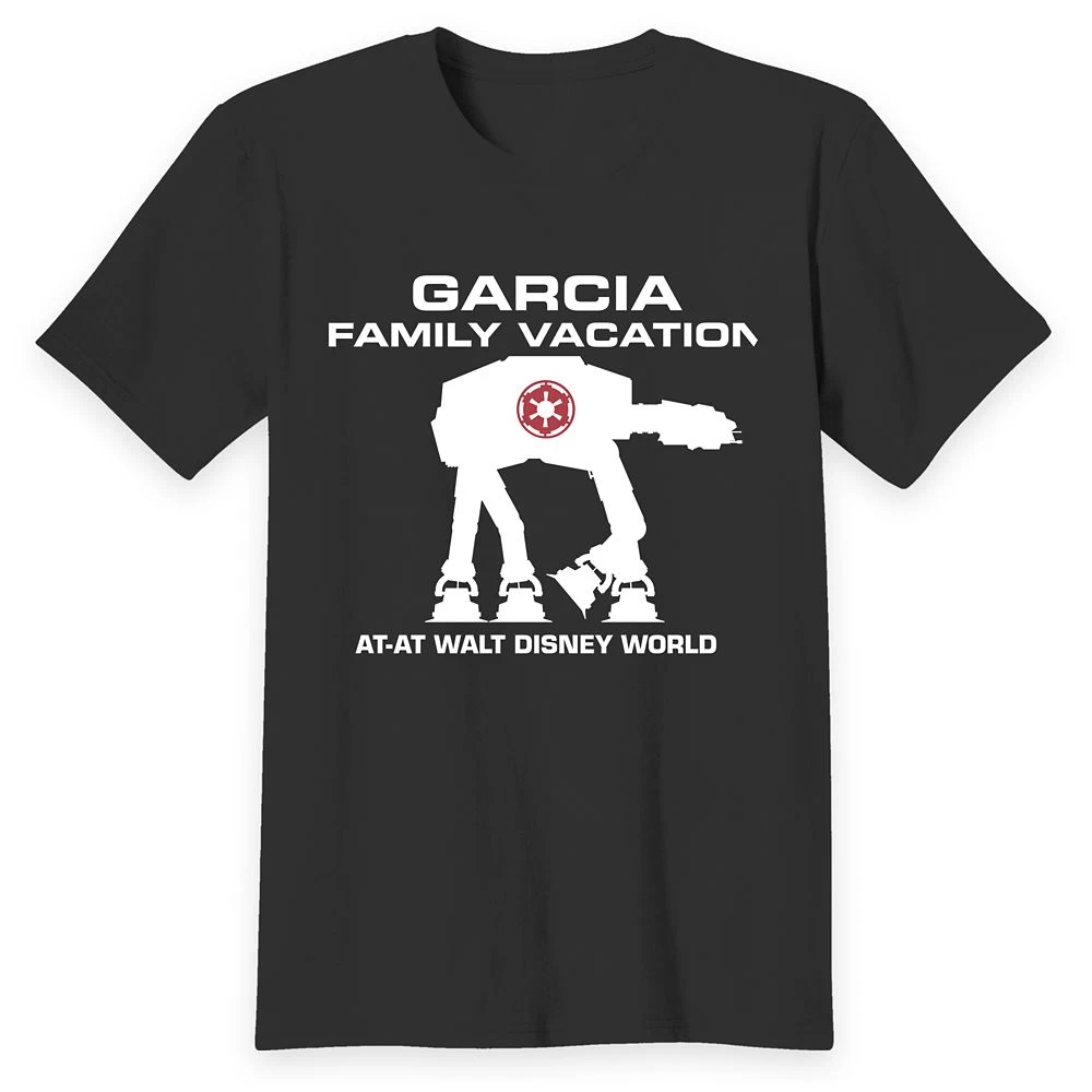 Team up with an AT-AT when wearing this Star Wars t-shirt on your trip to Walt Disney World. Featuring a crew neckline and an All Terrain Armored Transport walker, it can be customized with your family’s name.