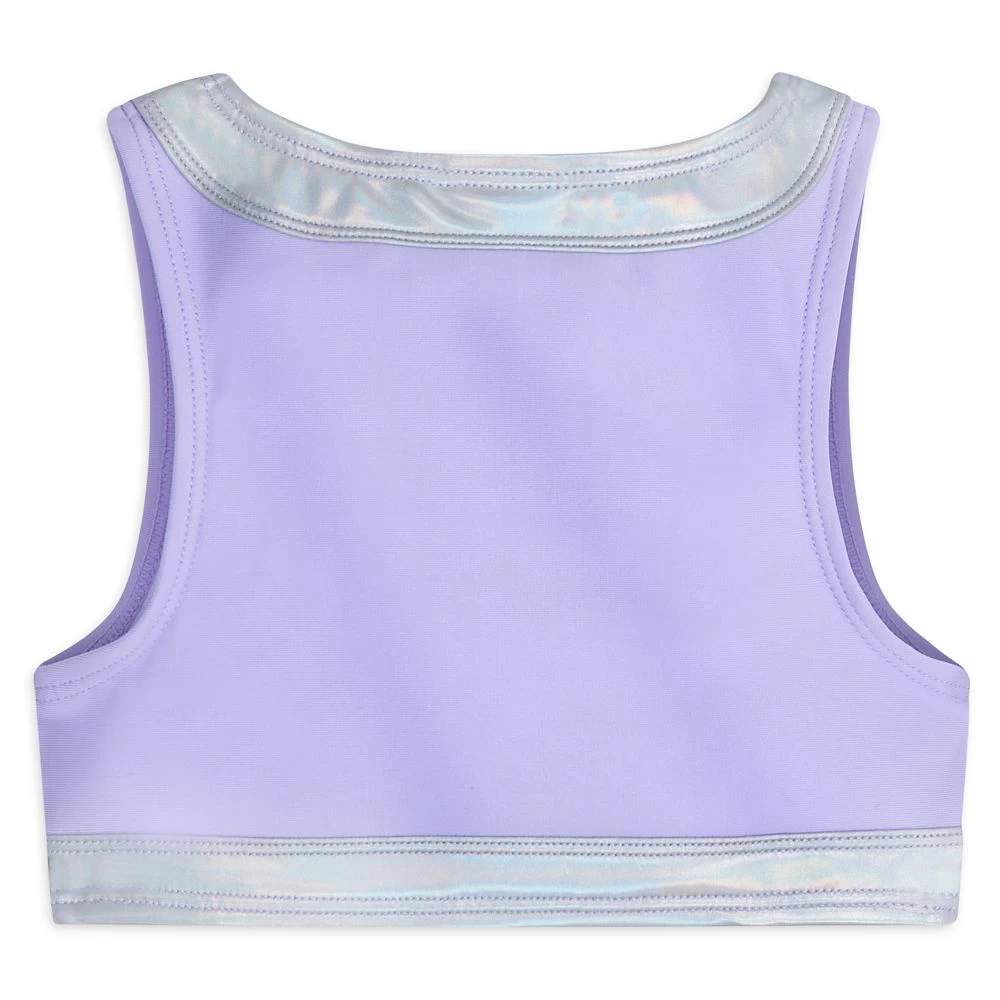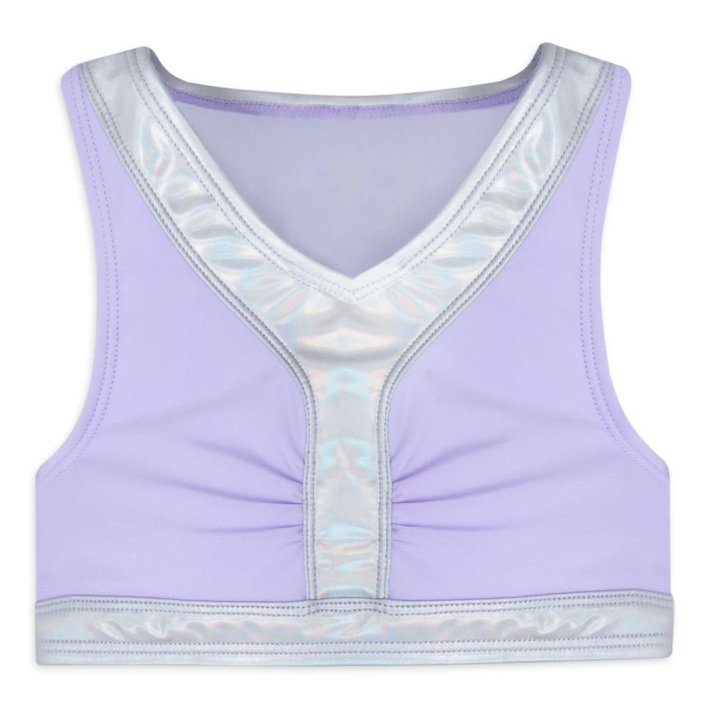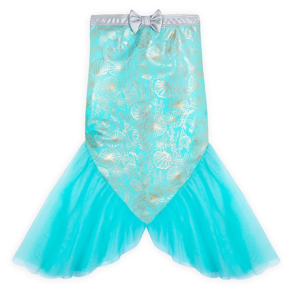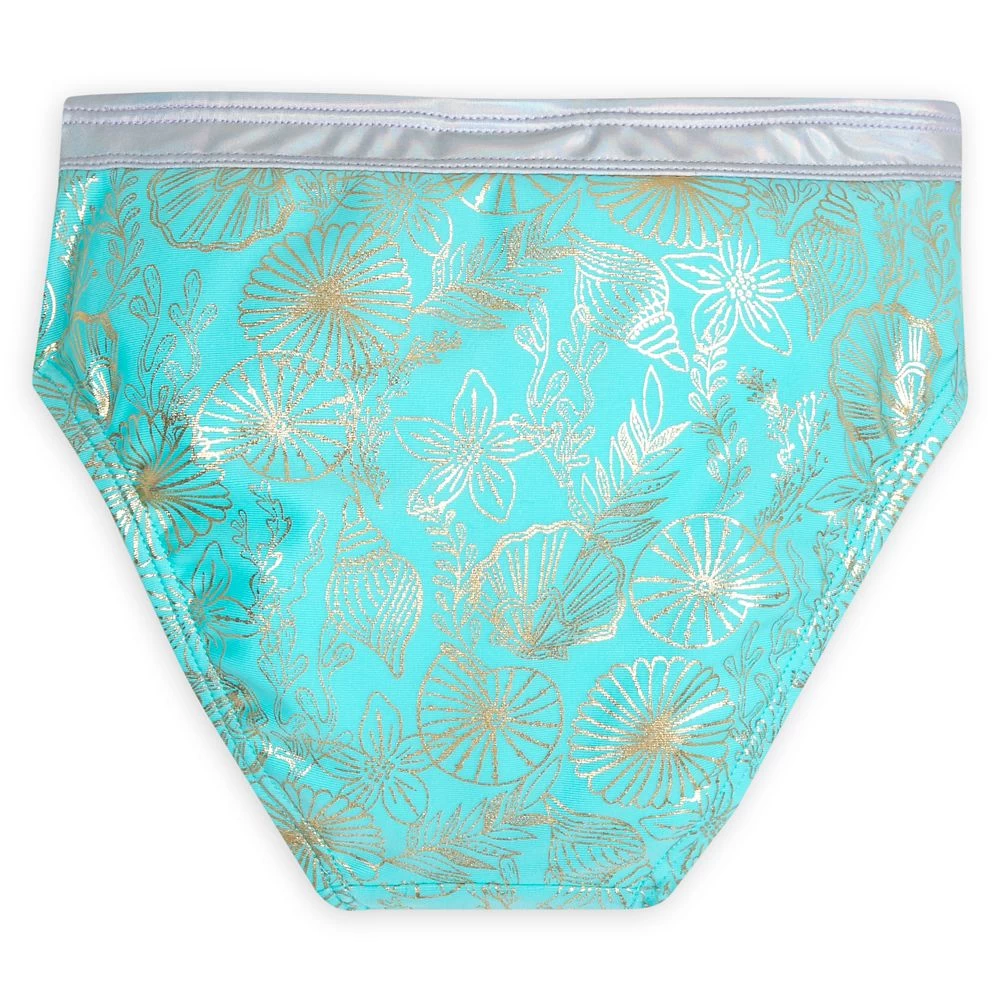 The littler the mermaid, the bigger the dreams. This Ariel deluxe swim set is just the thing to set those dreams soaring. Inspired by Disney’s The Little Mermaid, the three-piece set includes a top, bottom and a long mermaid tail skirt with organza trim. Each piece has shiny silver trim, and the bottom and skirt have an allover foil shell print.