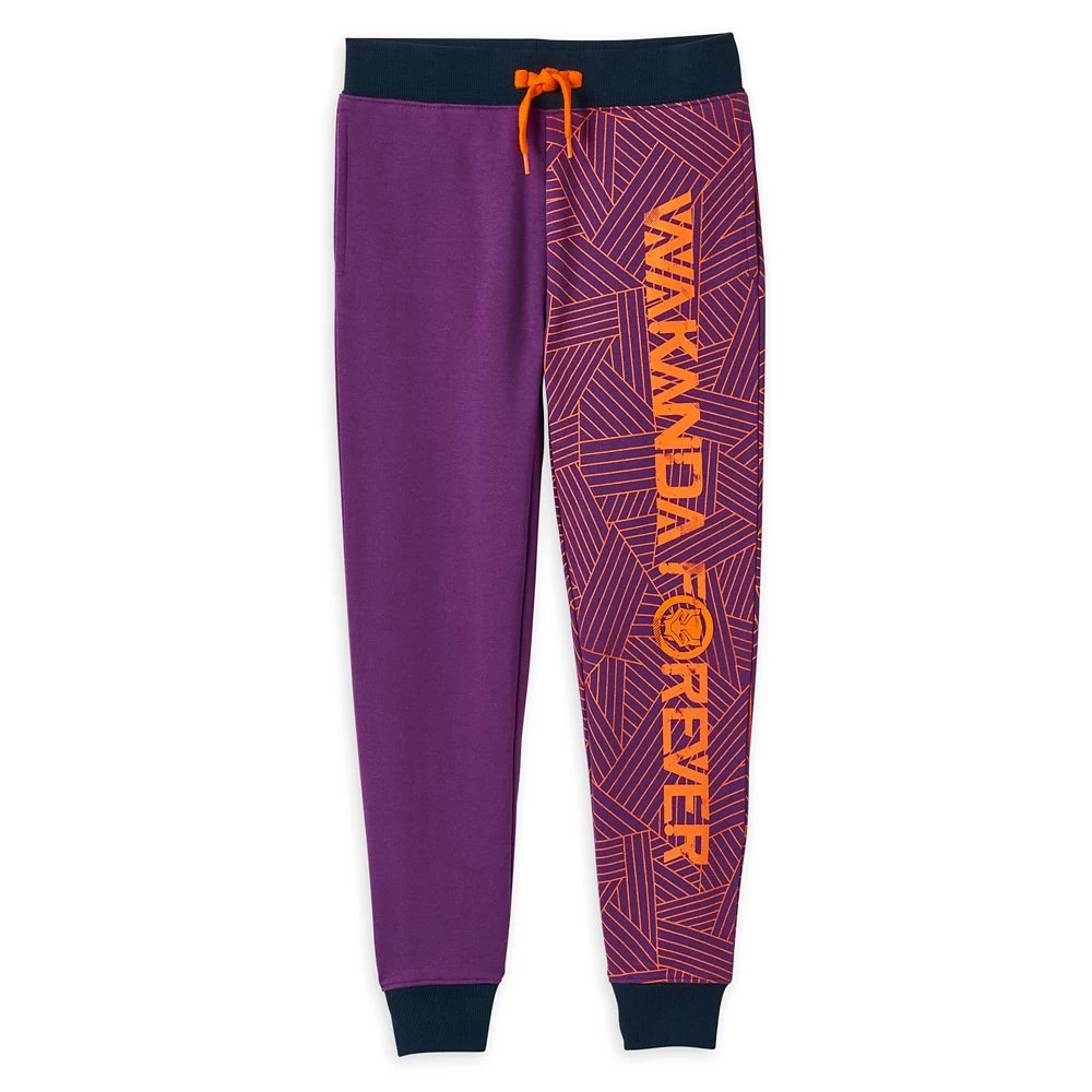 A Black Panther symbol is incorporated in the letter ”o” of the Wakanda Forever slogan on the left leg of these jogger sweatpants which include a bold geometric pattern. The contrasting purple right leg is complemented by the black waistband and cuffs, making this a great addition to our World of Wakanda collection!