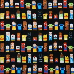 - Embroidered, stylized characters include Mickey Mouse, Minnie Mouse, Donald Duck, Snow White, Winnie the Pooh, Simba, Stitch, Elsa, Tiana, Moana, Woody, Miguel, Grogu, Chewbacca, Spider-Man and Black Panther