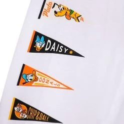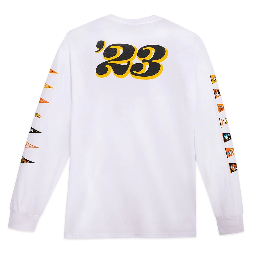 Cheers to the year 2023 in this fun and colorful Disneyland pennant flag long sleeve tee. On the front is a dated pennant flag featuring the classic Disneyland logo and your favorite cheer squad: Mickey Mouse, Minnie Mouse, Donald Duck, Daisy Duck and Goofy. Pluto and Chip ‘n Dale join the others in colorful pennants running down both sleeves. On the back of this cool tee? An exit-making ’23’.