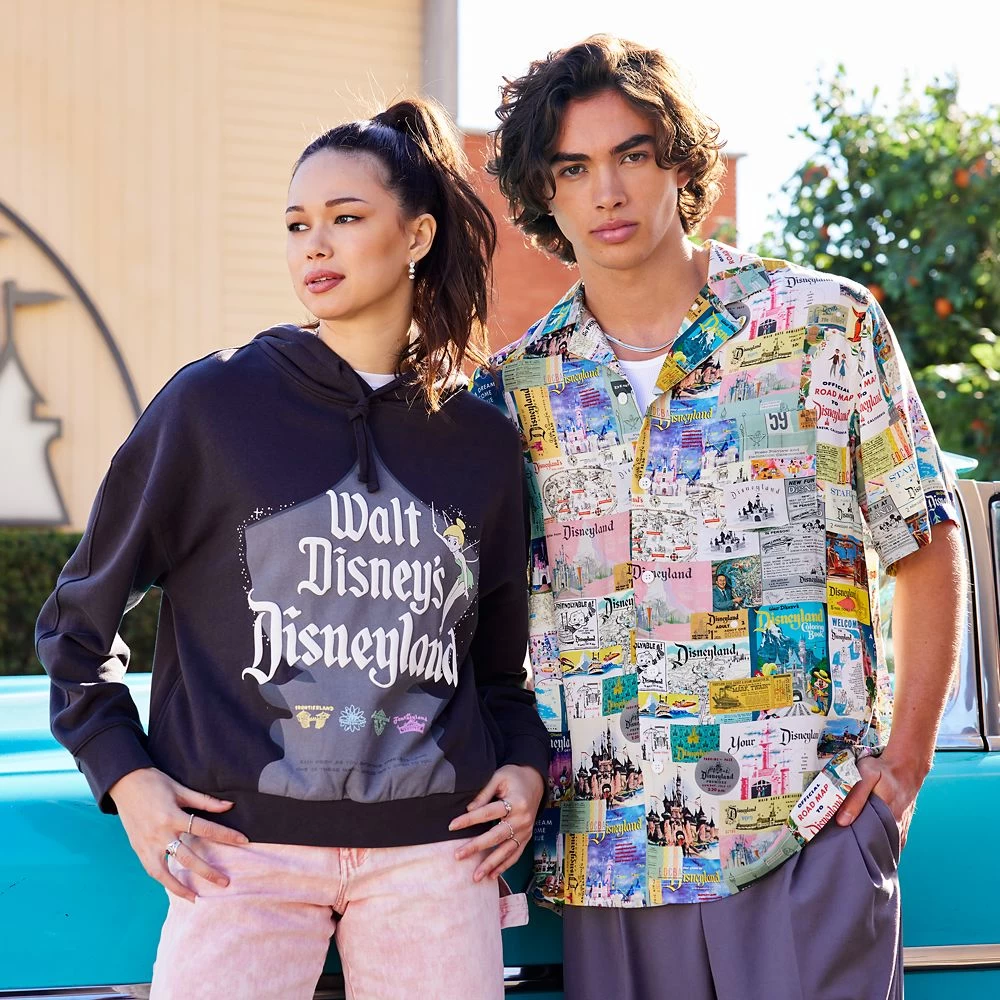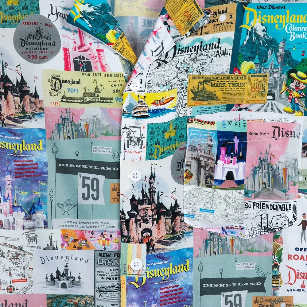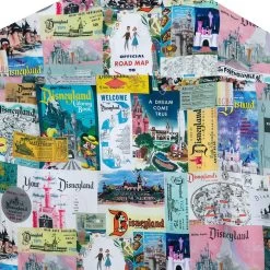 A nostalgic collage of vintage Disneyland print media makes a magical impression on this woven button front camp shirt with collar and chest pocket. It’s a dapper look for any Disney day!