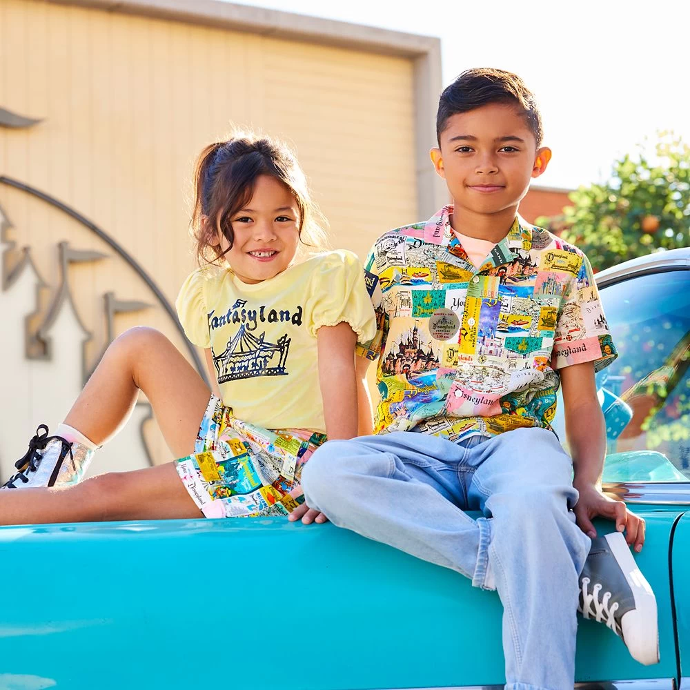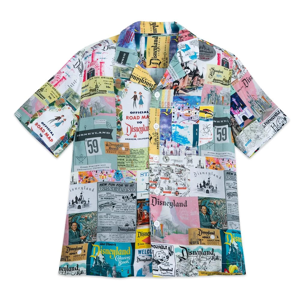 A nostalgic collage of vintage Disneyland print media makes a magical impression on this woven button front camp shirt with collar and chest pocket. It’s a dapper look for any Disney day!