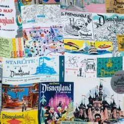 - Allover vintage Disneyland print media collage includes admission tickets, ads, maps, decals, coloring books, and much more