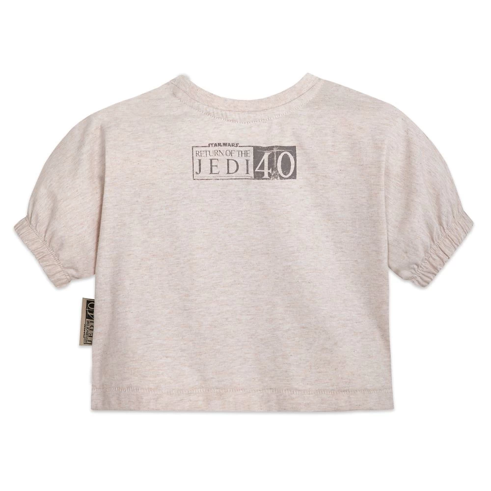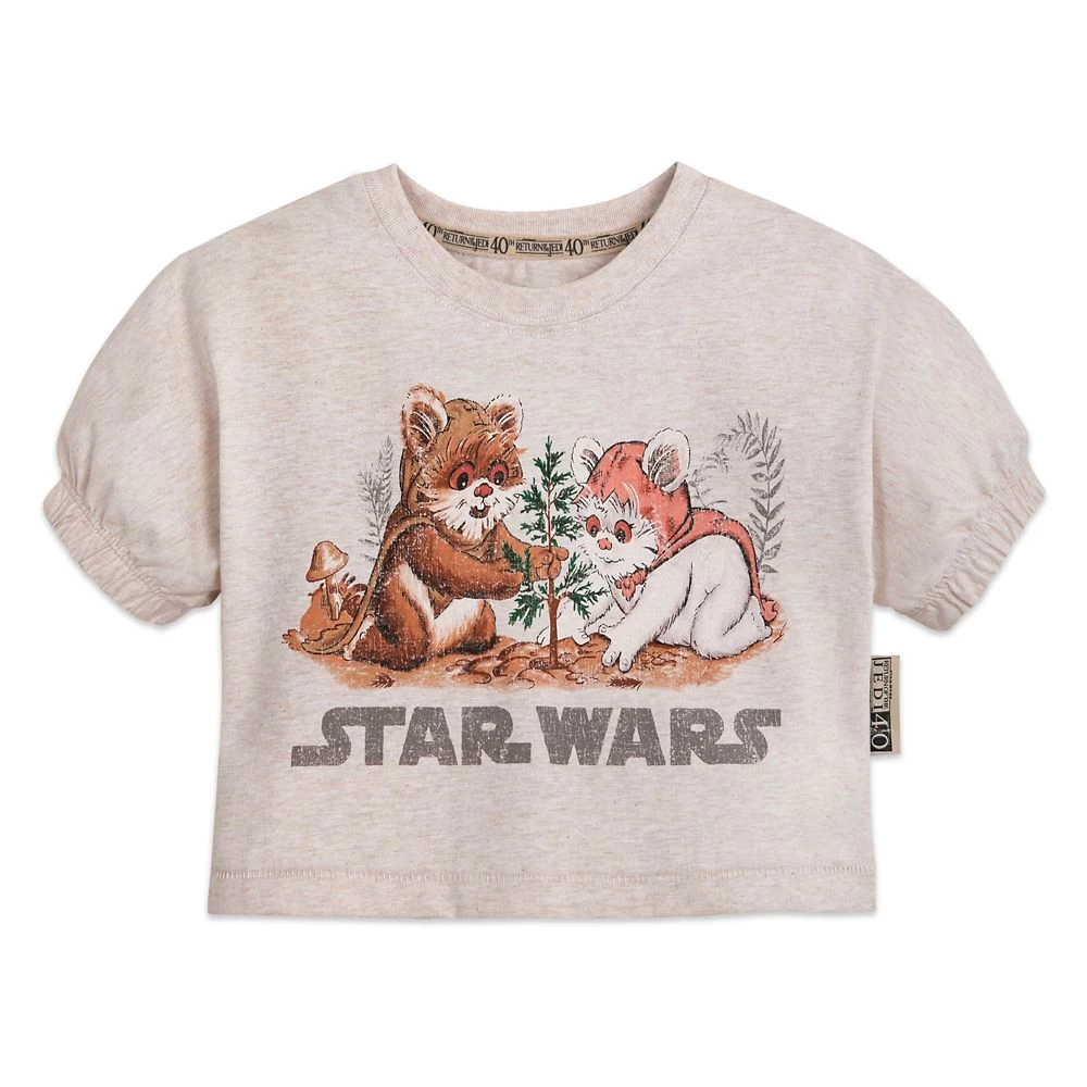 Wicket and Princess Kneesaa of Endor plant a tree on this adorable Ewoks fashion top inspired by Star Wars: Return of the Jedi. What better way to celebrate the film’s anniversary than by adding to the forest where the adventures takes place. The screen art’s distressed look and the Star Wars: Return of the Jedi 40th Anniversary stamp, woven tag and neck tape add vintage appeal to this cropped top with pretty puff sleeves. It’s the perfect way to ”Alaay loo ta nuv,” which means ”celebrate the love,” of the beloved film.
