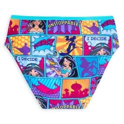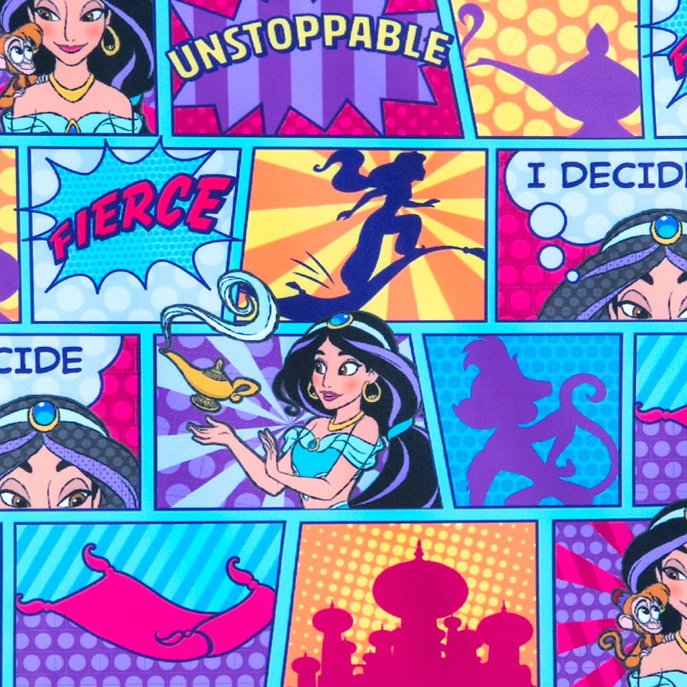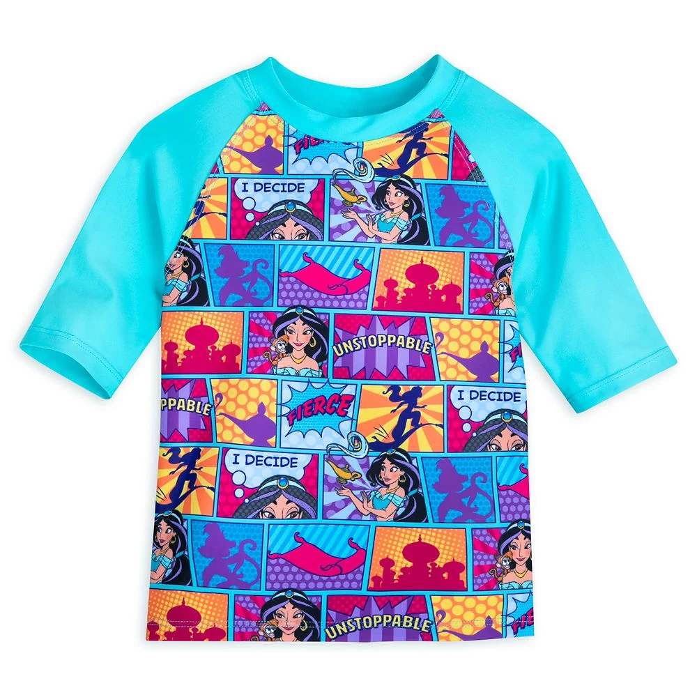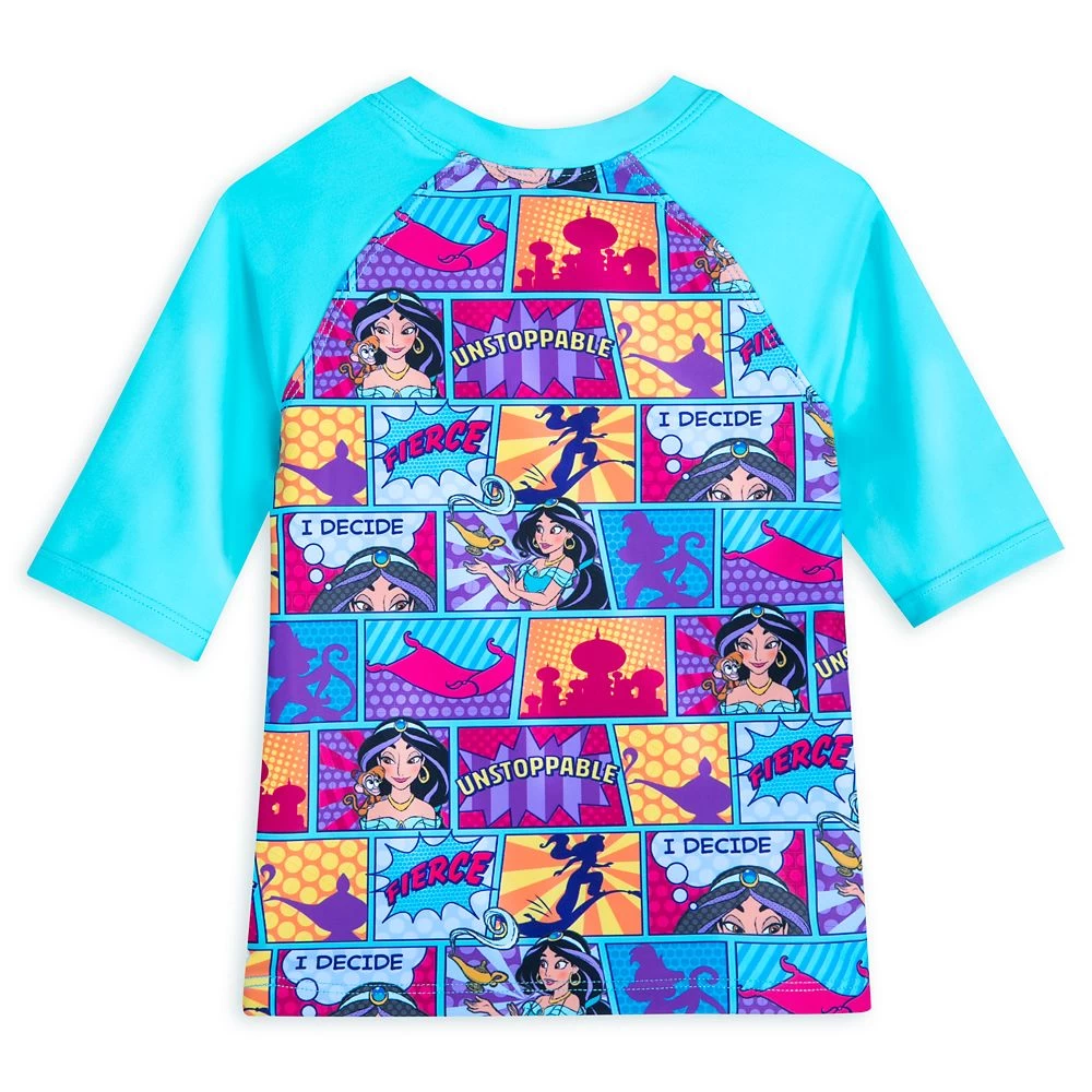 Fierce and unstoppable, that’s your little one. This Jasmine four-piece swim set celebrates that spirit with an allover print featuring the adventures of Jasmine. Inspired by Disney’s animated Aladdin, the set includes a stylish two-piece swimsuit, a rash guard with UPF 50+ built-in UV protection and a hair scrunchie.
