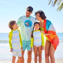 Splish, splash they’ll have a blast wearing this colorful Mickey Mouse and Friends rash guard with UPF 50+ built-in UV protection. The fun allover pattern features Mickey, Donald Duck, Goofy and Pluto looking ready for adventure with your little one, whether it’s riding waves or building sandcastles in the sun.