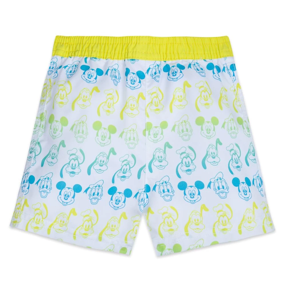 Your little one will love splashing about in the company of Mickey and his friends when they’re wearing these swim trunks. The smiling faces of Donald, Goofy and Pluto join Mickey in the allover print of this fun swimwear that features a bold yellow waistband.