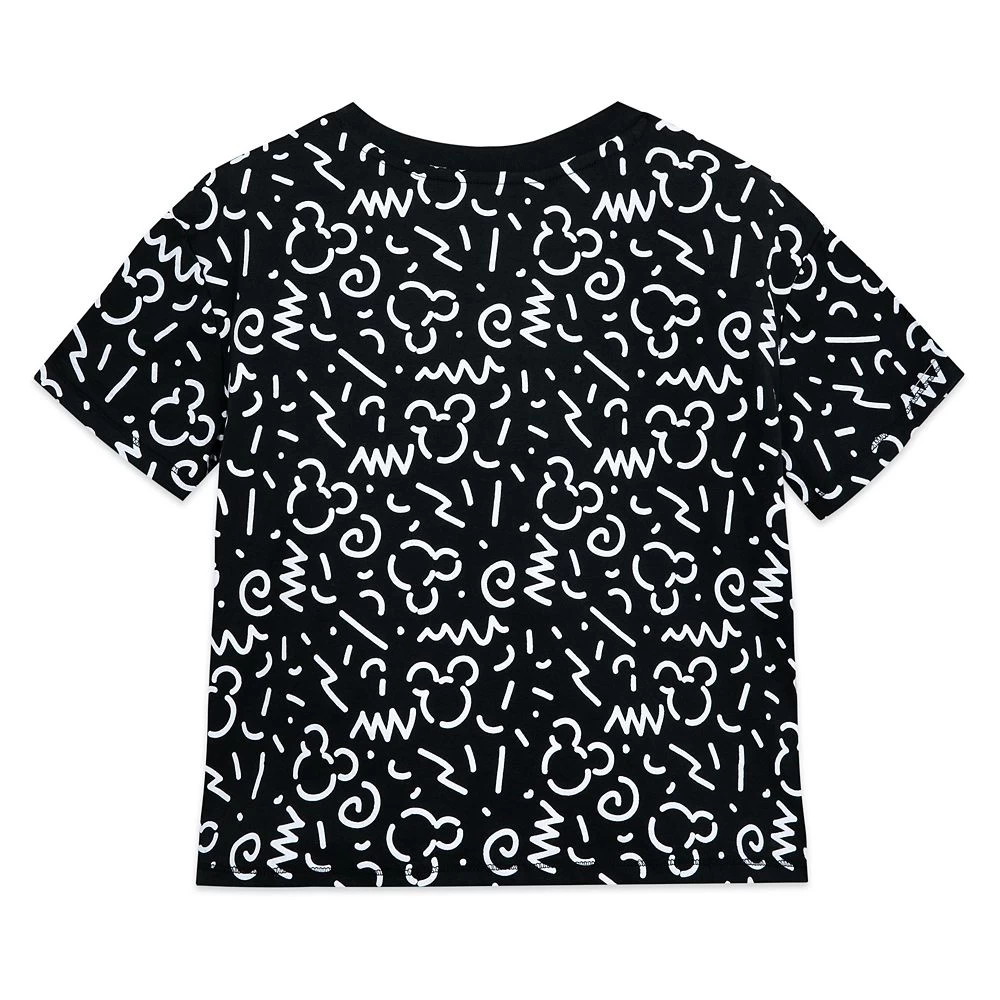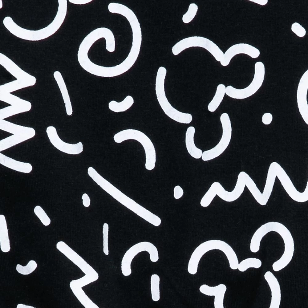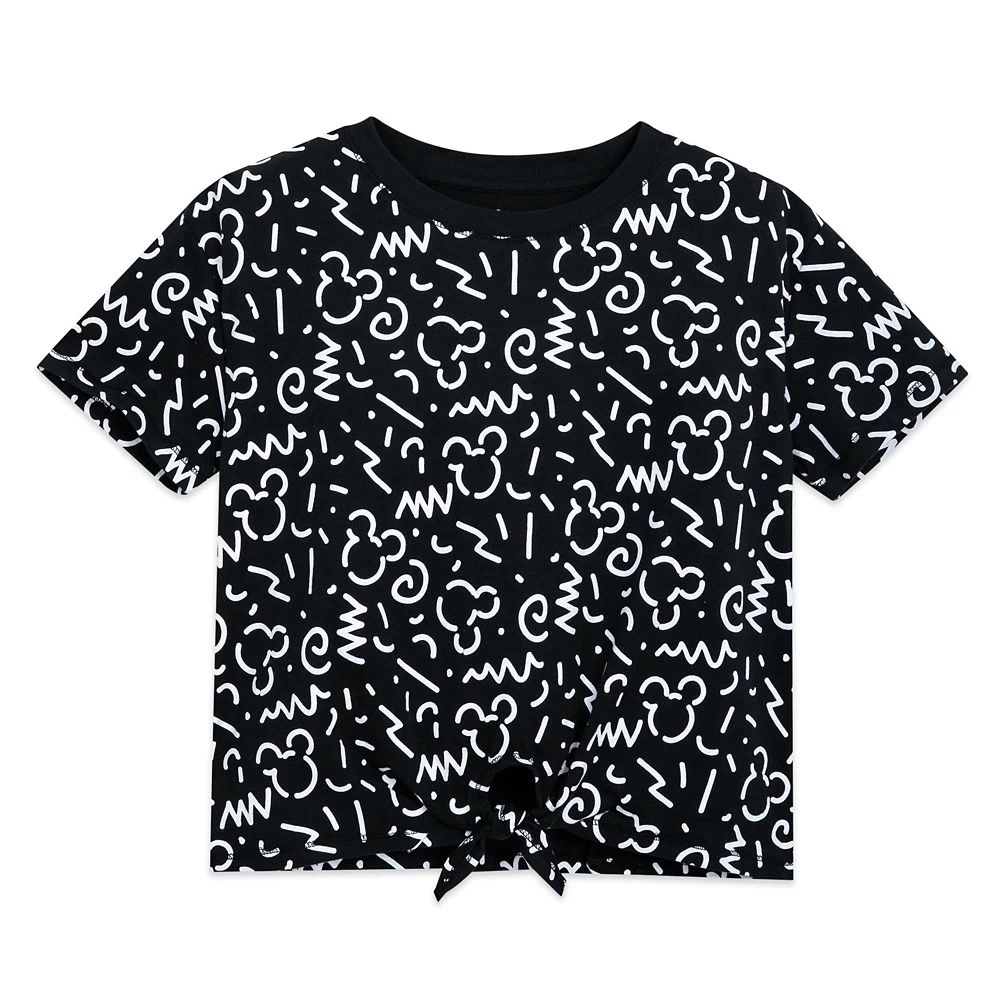 Flash back to the 1980s to rock this retro-look ”doodle” pattern featuring Mickey Mouse icons on a fashion tee for girls with scoop neckline and tie-up hem.