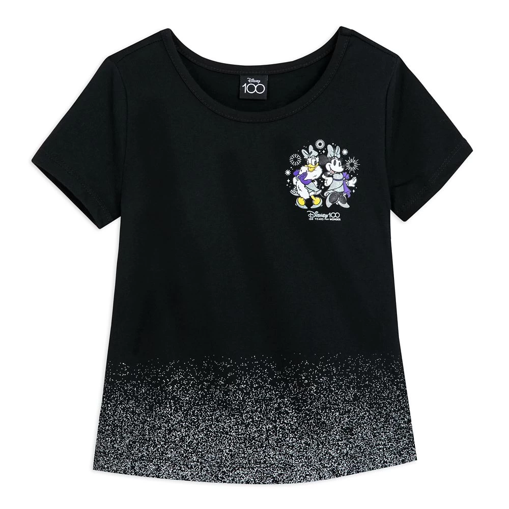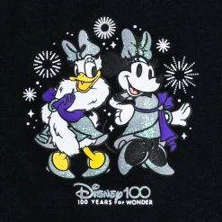 They will sparkle even brighter in this very special ”100 Years of Wonder” fashion top featuring glittery screen art of Minnie Mouse and Daisy Duck all dressed up for the party of the century. All around the bottom of the shirt is a flurry of puff paint confetti. Adding the perfect finishing touch on the back is the classic Disneyland Resort logo.
