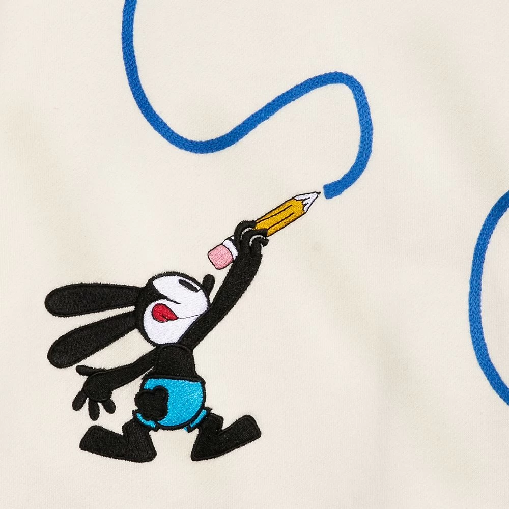 Let warm memories of Disney’s golden age carry you through the wintry months in this comfy cotton pullover. Embroidered artwork shows Walt Disney’s original creation, Oswald the Lucky Rabbit, exhibiting his artistic side as he draws a squiggly blue line allover this whimsical top.