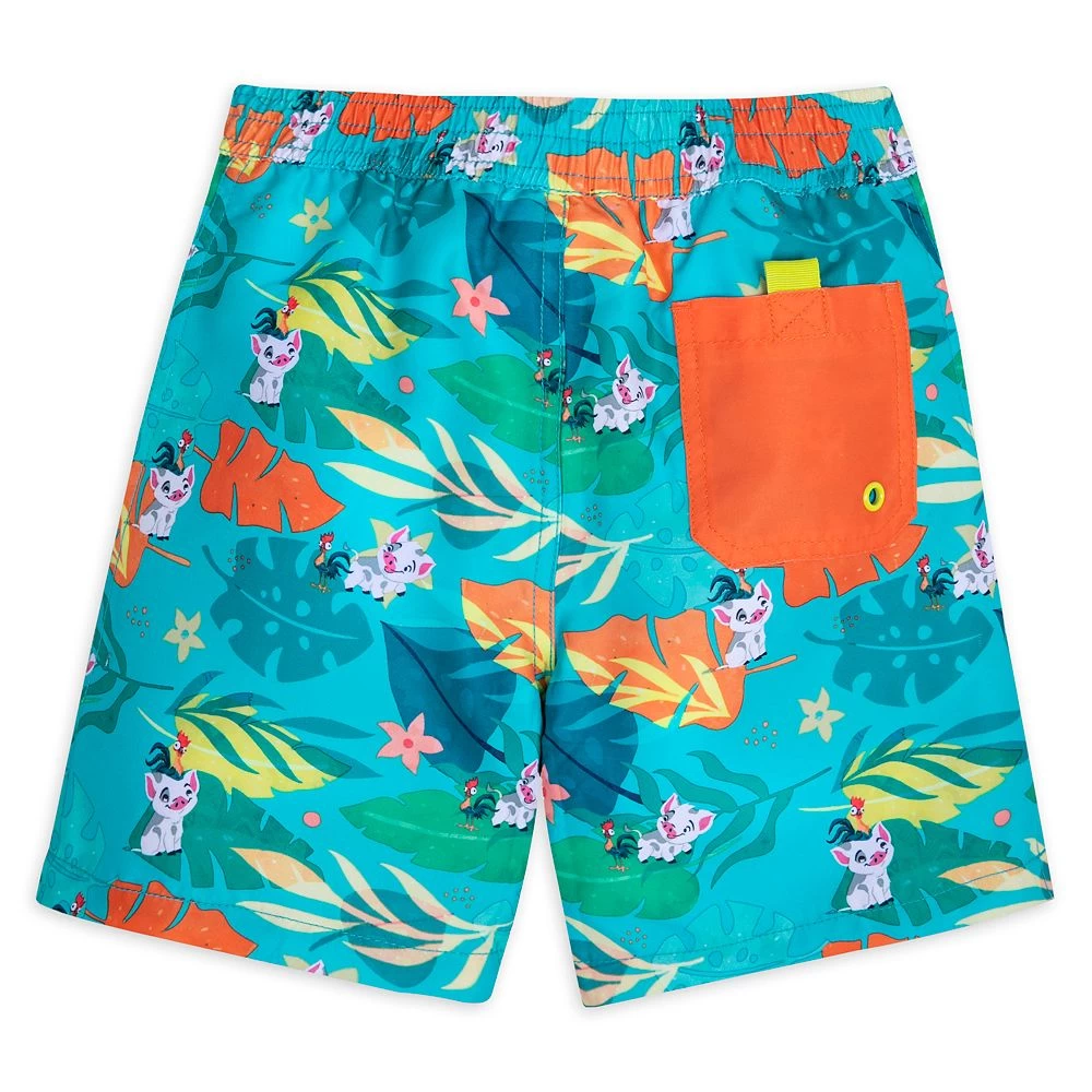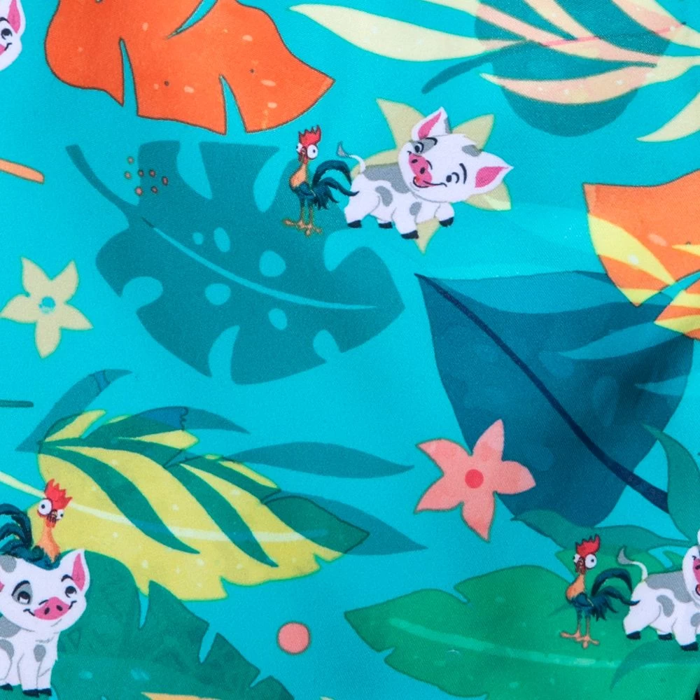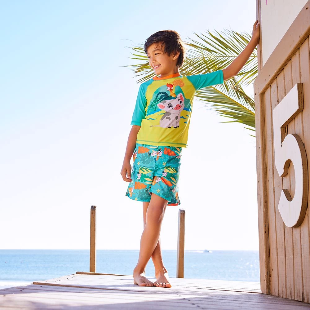 Hey, hey, they’ll be catching waves all day in these Pua and Hei Hei swim trunks. Inspired by Disney’s Moana, the allover tropical floral print features the wayfarer’s adorable sidekicks, Pua the pig and Hei Hei the rooster. Classic board short styling is taken up a notch with a decorative string tie in the front and UPF 50+ built-in UV protection.