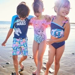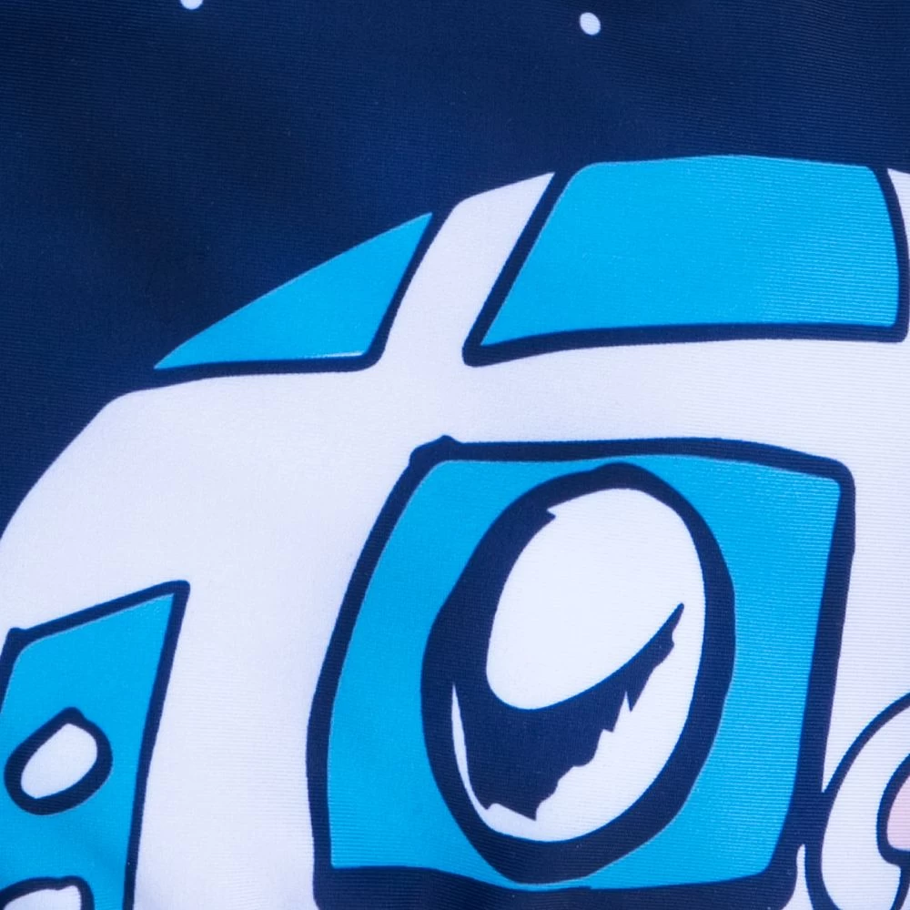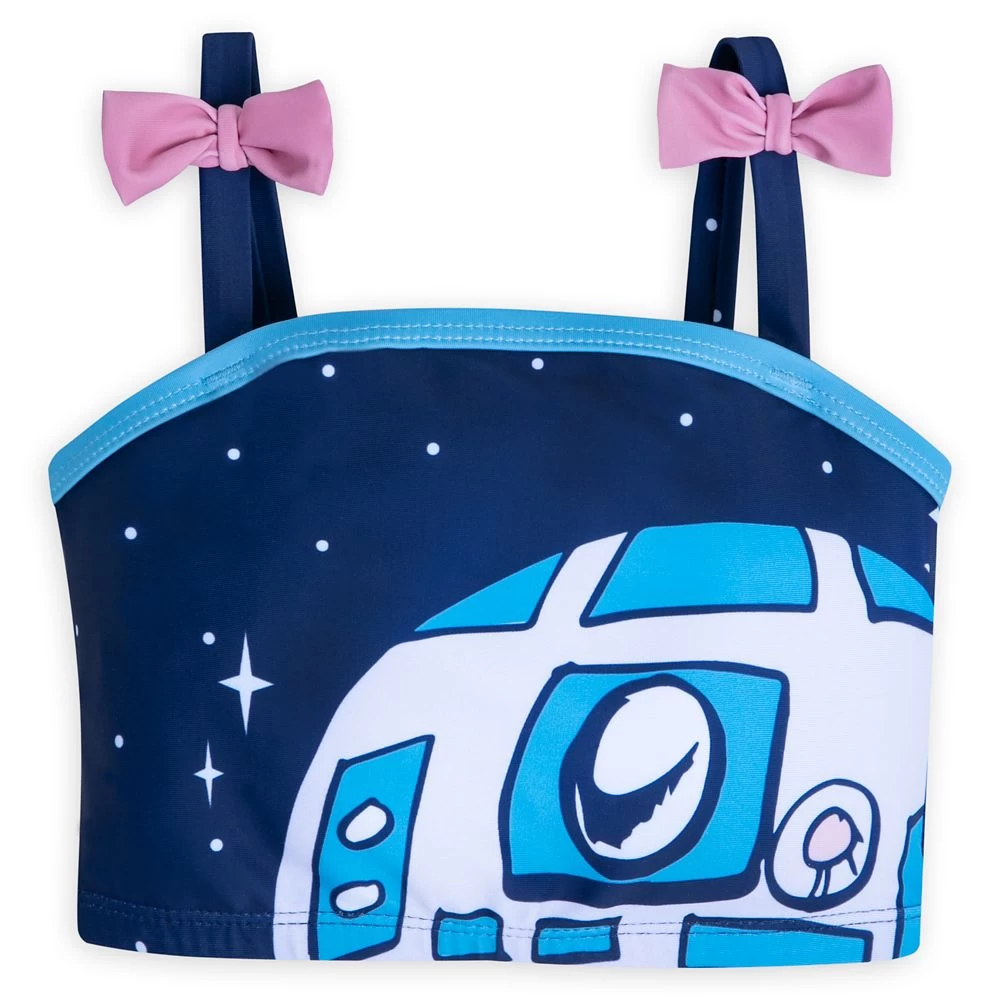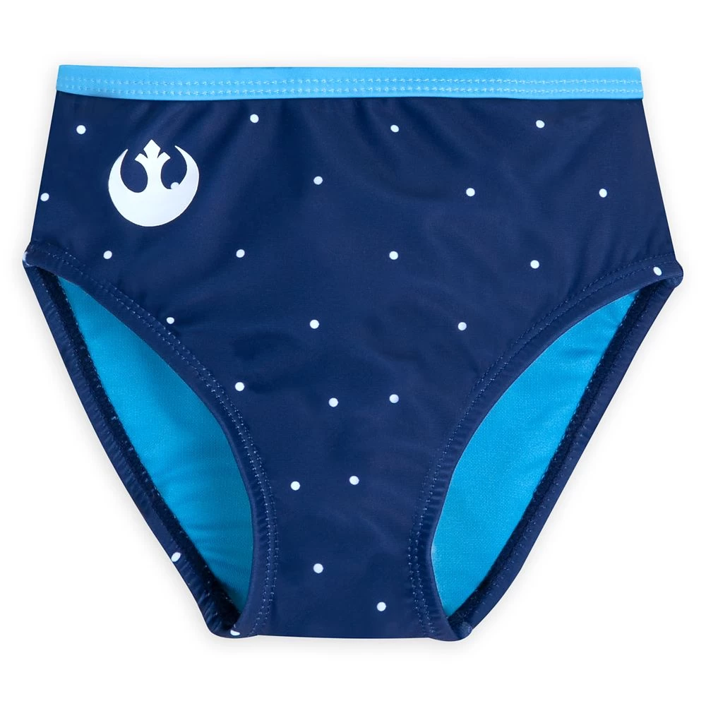 For the cutest member of the Rebel Alliance, this adorable R2-D2 two-piece swimsuit features stylized art of the beloved little droid. Inspired by the Star Wars saga, it has an allover starry sky print, blue trim and pretty bows on the spaghetti straps. The Alliance’s starbird insignia on the bottoms shows that your little one may be loyal to the Force, but the water is calling.