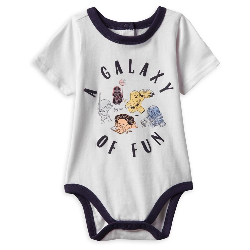 Choose their path wisely and clothe your youngling in this soft all-cotton bodysuit with its promise of ”A galaxy of fun”. Darth Vader and Chewbacca are among the cast of Star Wars: A New Hope who are feeling like kids again for a gleeful galactic design.