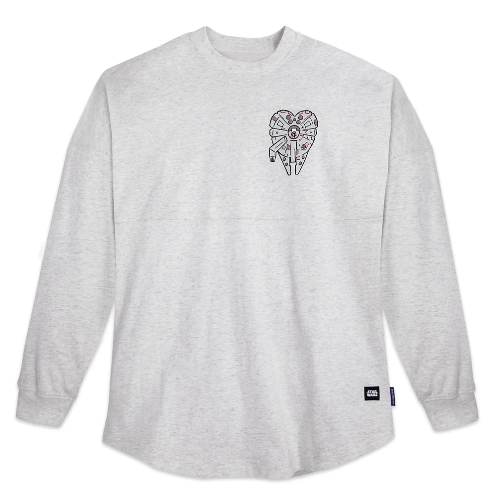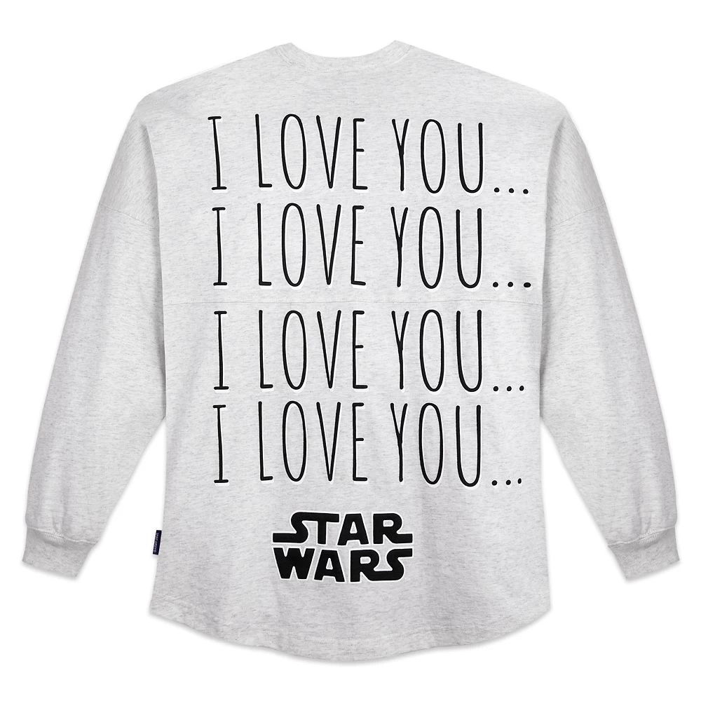Romance conquers the Star Wars galaxy with this pullover Spirit Jersey, featuring a heart-shaped Millennium Falcon on front and Princess Leia’s famous confession, ”I love you…” on the back. Look for the companion response Spirit Jersey sold separately.