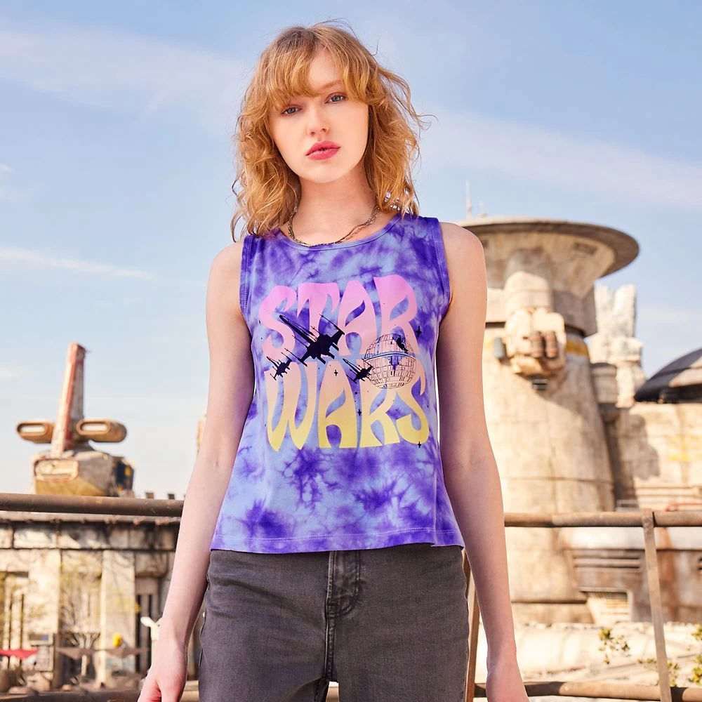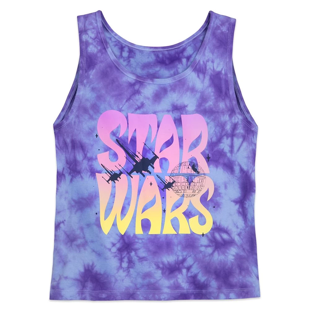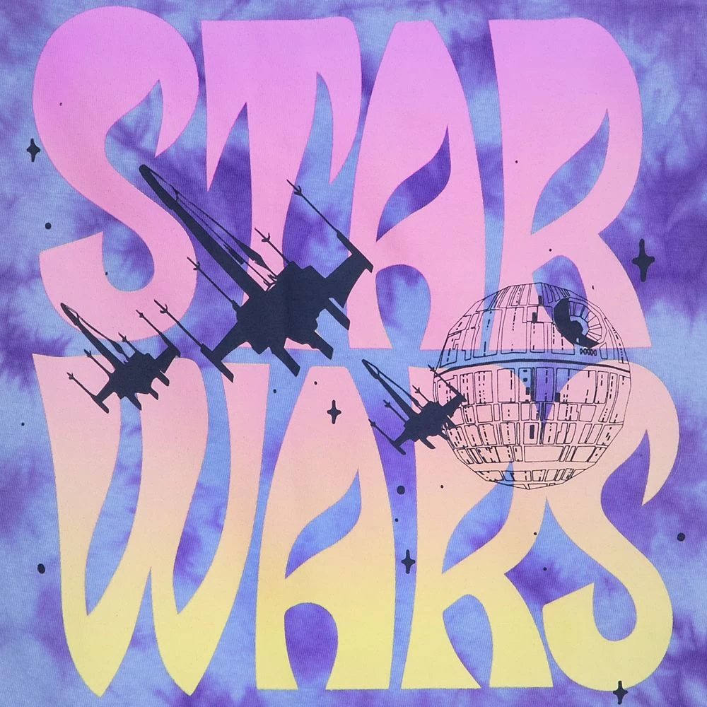 A squadron of X-wing starfighters is silhouetted against the bold tie-dye wash of this Star Wars tank top. The movie’s title is rendered in a large pastel typeface on the front, and includes an image of the Death Star, creating a top that’s definitely on the bright side.