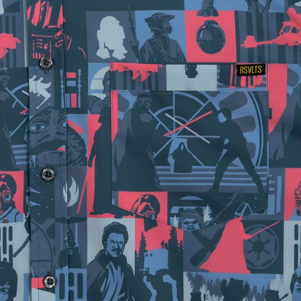 One classic inspires another with this Star Wars ”Trilogy’s End” KUNUFLEXâ„¢ shirt by RSVLTS. Inspired by Star Wars: Return of the Jedi, the dramatic allover pattern features key moments and characters from the epic film including Luke Skywalker, Lando Calrissian, Darth Vader, Boba Fett and others. Classically styled with a button collar, button front and a shirttail hem, this short sleeve shirt is as comfortable as it is stylish. Like the film that inspired it, it’s destined to be an all-time favorite.