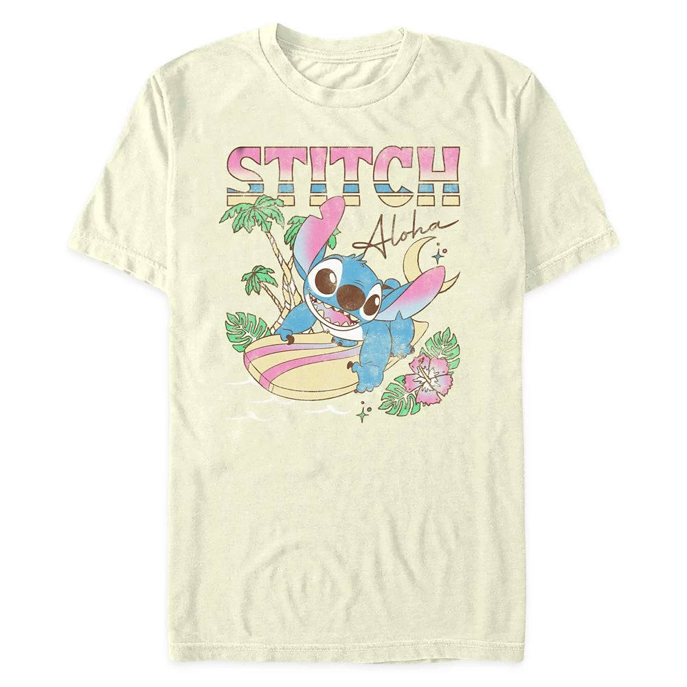 Surf’s up for summertime fun with Stitch in this ”Aloha” all-cotton tee featuring tropical motifs and a faded vintage look. Ride the wild waves with our mischief-making mascot.