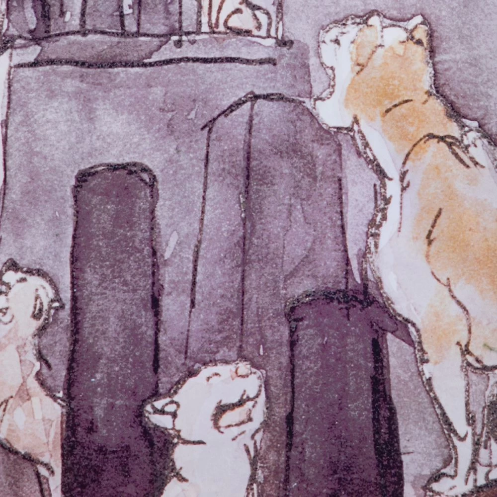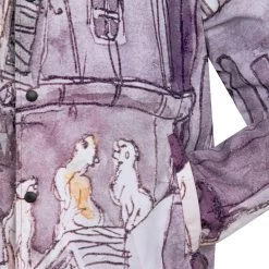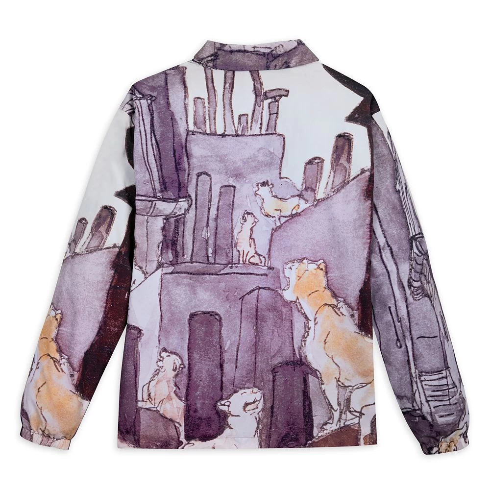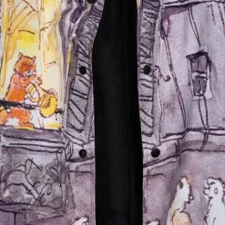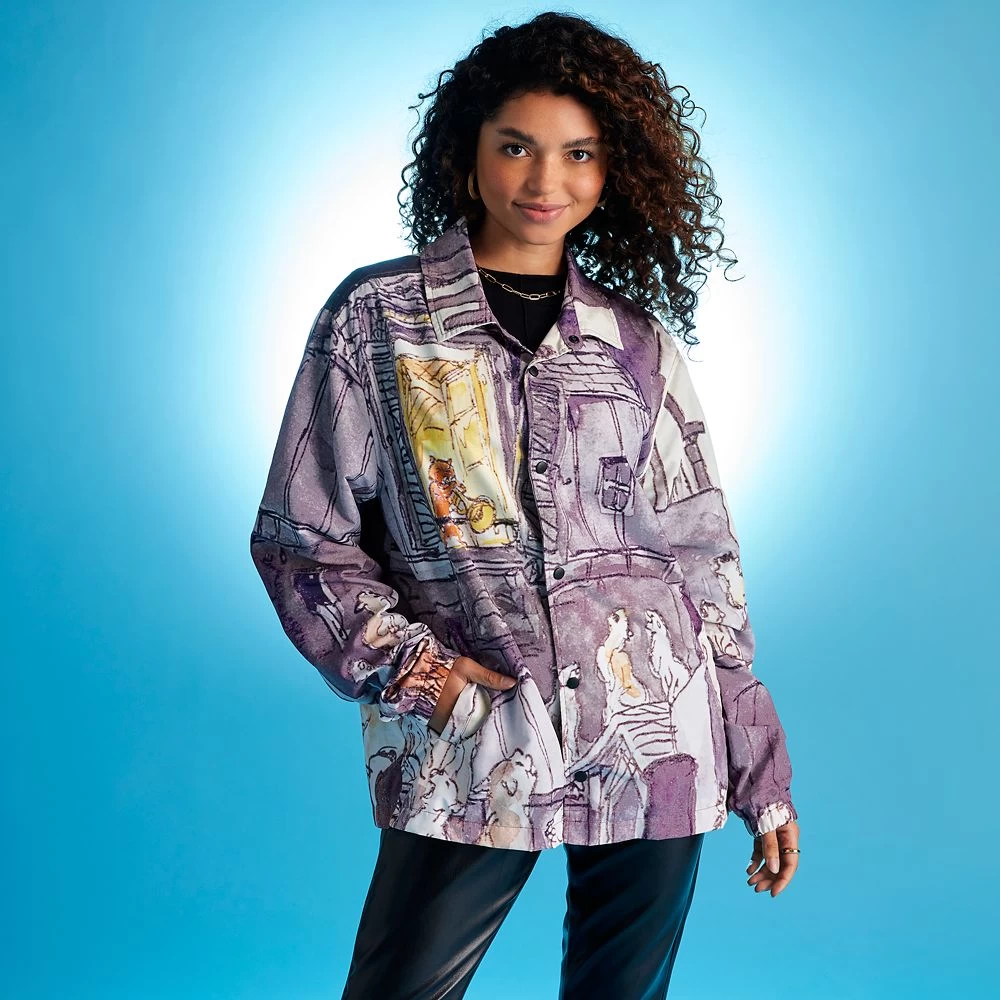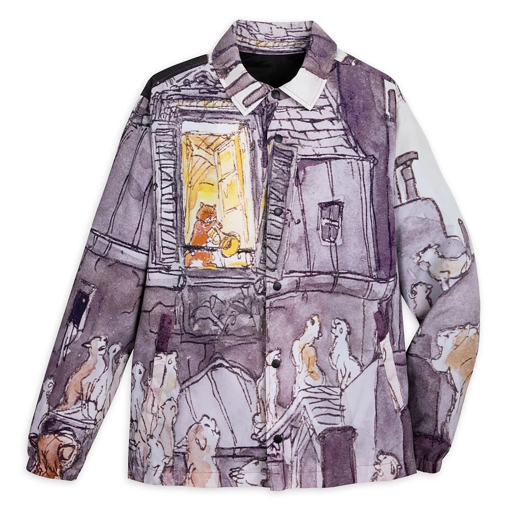 Imagine walking down a Parisian street one moonlit evening when suddenly you hear music. You follow the sound and find yourself in the middle of an impromptu jazz concert with some very cool cats. This is how you’ll feel wearing this Aristocats jacket featuring an allover print of a feline jam session. Inspired by a scene in Walt Disney’s The Aristocats, the digital watercolor style print evokes the charm and sophistication of the classic film. The jacket’s collar, snap front and elastic cuffs make it as cozy as it is chic.