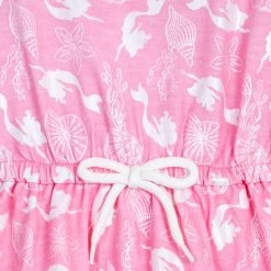 After a fun day swimmin’, bright young things can party at the palace in this lovely Little Mermaid knit dress.Β Ariel silhouettes and seashells make a pretty print pattern on this dress that features dropped shoulders, ruffled sleeve trims and a layered skirt with an overlay cut on the bias.