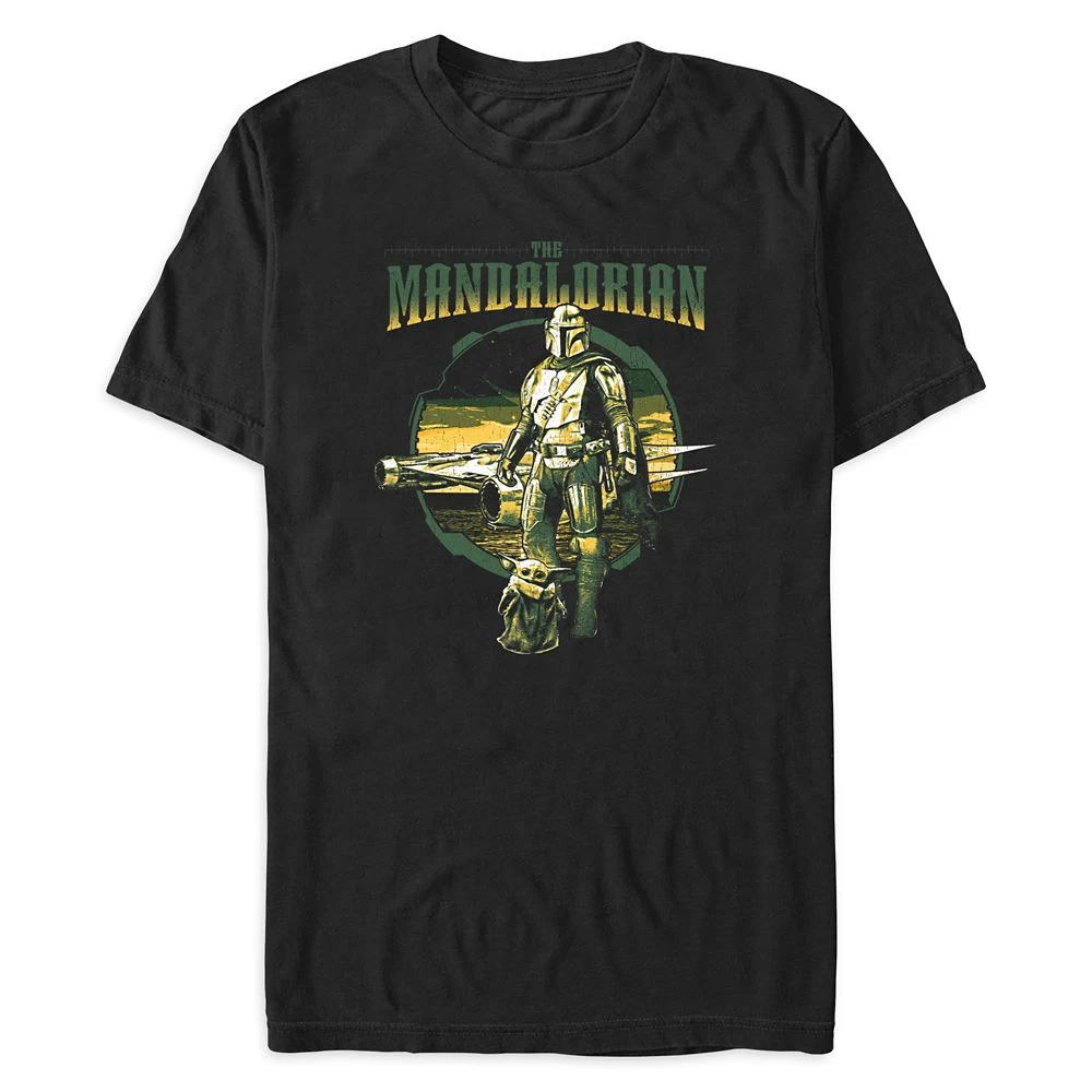 The Mandalorian stands between his N-1 starfighter and Grogu on this t-shirt inspired by season three of Star Wars: The Mandalorian on Disney+. The legendary bounty hunter’s name is emblazoned across the front of this soft cotton tee that you’ll want to protect equally carefully.