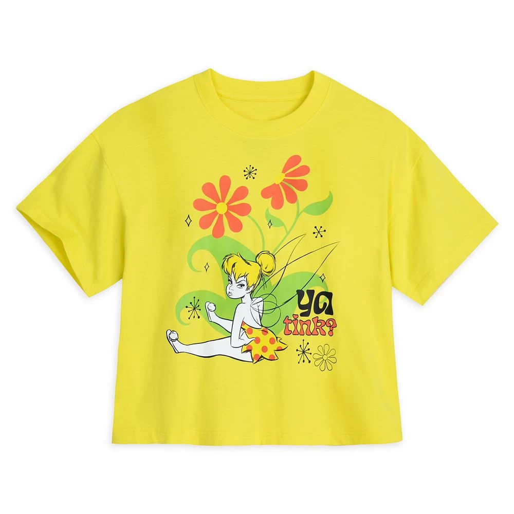 Tinker Bell shows plenty of attitude on this crop top which declaims the question ”Ya tink?” The feisty little pixie is pictured in a polka dot dress against a floral background on the bold yellow tee that will brighten any day . . . although maybe not Tink’s!