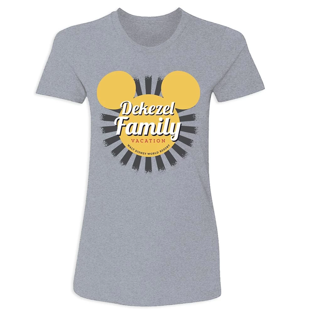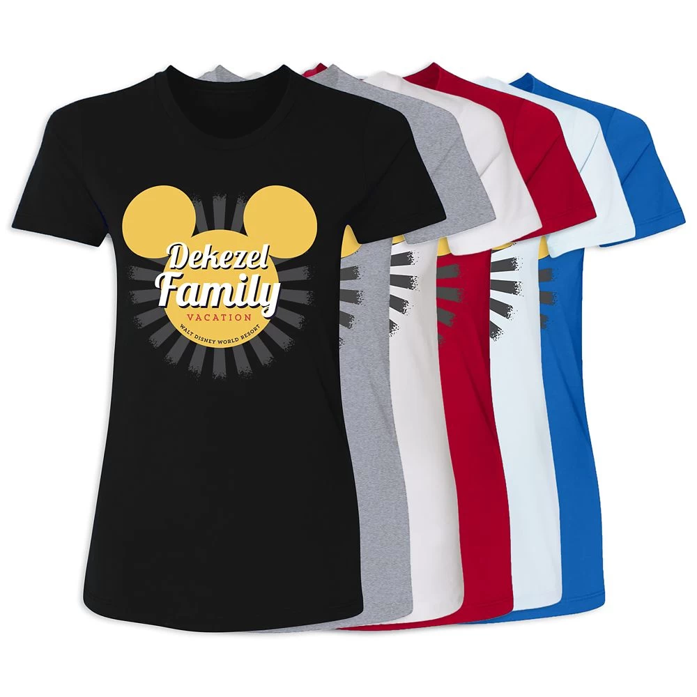 Add a personal touch to your trip down Main Street in this Walt Disney World t-shirt. Available in a choice of colors, it features Mickey’s stylized silhouette paired with a personalized name, lending a familial flair to any Disney Parks adventure!